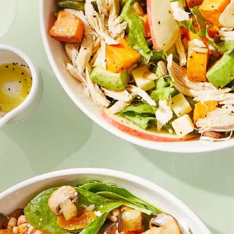 या साध्या हाय-प्रोटीन सॅलड रेसिपींपैकी एकासह ताजेतवाने, समाधानकारक डिनरचा आनंद घ्या. विक्रमी वेळेत स्वयंपाकघरात येण्यासाठी आणि बाहेर येण्यासाठी प्रत्येक रेसिपीसाठी फक्त 15 मिनिटे किंवा त्यापेक्षा कमी सक्रिय तयारी वेळ लागतो. आमची चिरलेली इटालियन चण्याची कोशिंबीर आणि आमची चिरलेली चिकन आणि गोड बटाटा सॅलड यांसारख्या पाककृती किमान 15 ग्रॅम प्रथिने प्रति सर्व्हिंग, जेणेकरून तुम्ही दिवसाच्या शेवटी निरोगी, भरभरून रात्रीच्या जेवणाचा आनंद घेऊ शकता.