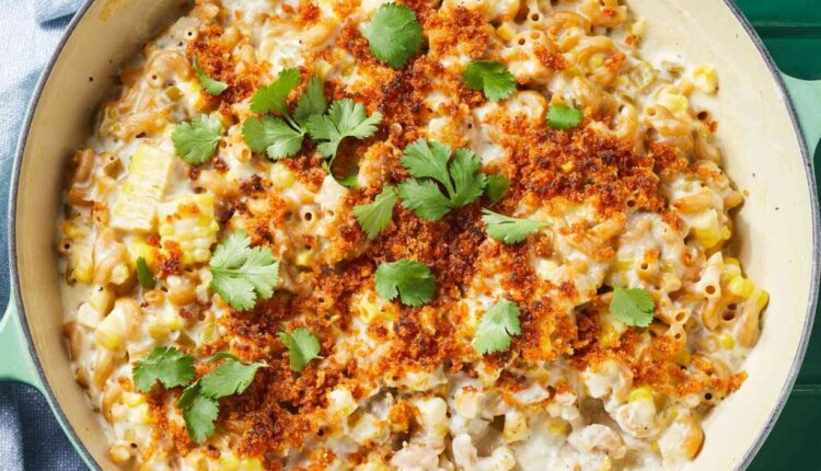 हे क्रीमी मॅक आणि चीज ताज्या कॉर्न कर्नलच्या गोड पॉप्ससह चेडर चीजच्या तीक्ष्ण चवसह पॉप करतात. सॉसमध्ये संपूर्ण कॉर्नकोब शिजवल्याने ताज्या कॉर्नची चव समोर येते, परंतु जर तुम्ही चिमूटभर असाल तर त्याऐवजी बेकिंग करण्यापूर्वी मिश्रणात 1½ कप वितळलेले गोठलेले कॉर्न कर्नल घालू शकता.