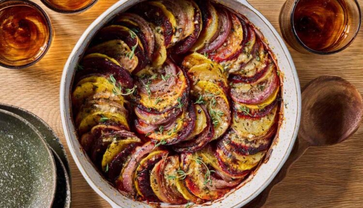 बटरनट स्क्वॅश, लाल कांदा, बटाटा आणि बीट्सचे थर एकत्र करून हे आश्चर्यकारक कॅसरोल तयार करतात. प्रत्येक चाव्याला मसालेदार चव येण्यासाठी भाजीवर लसूण टाकलेले तेल घासले जाते.