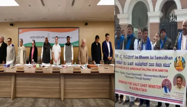 कर्नाटकमध्ये दलित मुख्यमंत्रिपदाच्या मागणीसाठी काँग्रेस कार्यकर्त्यांनी सीडब्ल्यूसी बैठकीदरम्यान काँग्रेस मुख्यालयाबाहेर निदर्शने केली.