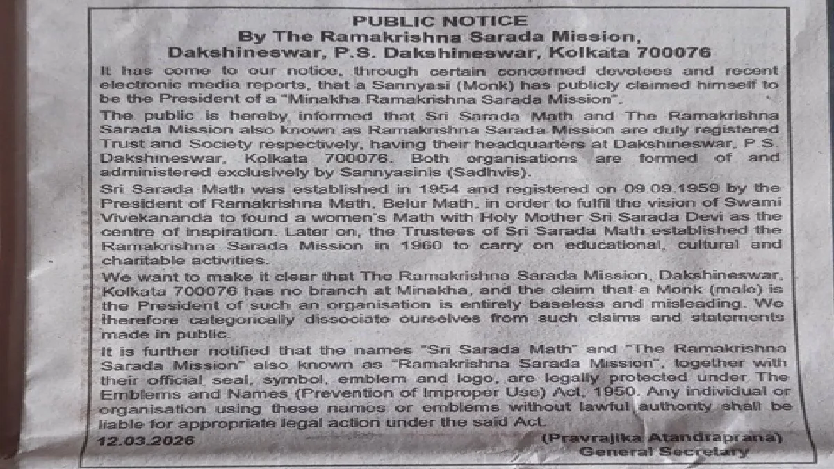 जेव्हा भगवे कपडे घातलेल्या व्यक्तीने टीएमसीच्या निषेध मंचावरून आरोप केला की एसआयआरमध्ये त्याचे नाव देखील काढून टाकण्यात आले आहे, तेव्हा ममता बॅनर्जींनी त्याला उपस्थित असलेल्यांना आपले कागदपत्र दाखवण्यास सांगितले होते. यानंतर त्याने तेच केले. आंदोलनाला आलेला भगवा परिधान केलेल्या व्यक्तीनेही देशाच्या दुरवस्थेबद्दल बोलले. एसआयआर बंद करा, असेही सांगण्यात आले. आता रामकृष्ण शारदा मिशनने या व्यक्तीचे दावे खोटे असल्याचे उघड केले आहे. रामकृष्ण शारदा मिशनने रविवारी कोलकात्यातील वर्तमानपत्रात जाहिरात दिली असून उत्तर २४ परगण्यातील मीनाखानमध्ये त्यांची कोणतीही शाखा नसल्याचे स्पष्ट केले आहे. याशिवाय रामकृष्ण शारदा मिशननेही म्हटले आहे की, तेथील कोणताही संत संघटनेशी संबंधित नाही.