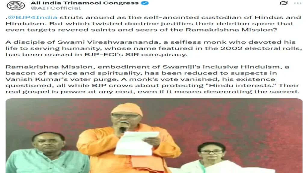 जेव्हा भगवे कपडे घातलेल्या व्यक्तीने टीएमसीच्या निषेध मंचावरून आरोप केला की एसआयआरमध्ये त्याचे नाव देखील काढून टाकण्यात आले आहे, तेव्हा ममता बॅनर्जींनी त्याला उपस्थित असलेल्यांना आपले कागदपत्र दाखवण्यास सांगितले होते. यानंतर त्याने तेच केले. आंदोलनाला आलेला भगवा परिधान केलेल्या व्यक्तीनेही देशाच्या दुरवस्थेबद्दल बोलले. एसआयआर बंद करा, असेही सांगण्यात आले. आता रामकृष्ण शारदा मिशनने या व्यक्तीचे दावे खोटे असल्याचे उघड केले आहे. रामकृष्ण शारदा मिशनने रविवारी कोलकात्यातील वर्तमानपत्रात जाहिरात दिली असून उत्तर २४ परगण्यातील मीनाखानमध्ये त्यांची कोणतीही शाखा नसल्याचे स्पष्ट केले आहे. याशिवाय रामकृष्ण शारदा मिशननेही म्हटले आहे की, तेथील कोणताही संत संघटनेशी संबंधित नाही.