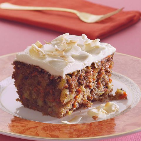 गाजर हे गाजर केकला आरोग्य-प्रभाव परिणाम देतात-लोकांना वाटते की ते आरोग्यदायी अन्न आहे, परंतु त्यात सहसा चरबी आणि कॅलरी जास्त असतात. परंतु आमच्या आवृत्तीमध्ये 40 टक्के कमी कॅलरी आणि 50 टक्के कमी चरबी आहे. प्रथम, आम्ही आमच्या पिठात कमी तेल वापरतो. मग आम्ही फ्रॉस्टिंगमध्ये लोणी सोडून देतो (काळजी करू नका, ते अद्याप हलके आणि गुळगुळीत आहे). केक ओलसर आहे याची खात्री करण्यासाठी, आम्ही नॉनफॅट ताक आणि ठेचलेले अननस घालतो.