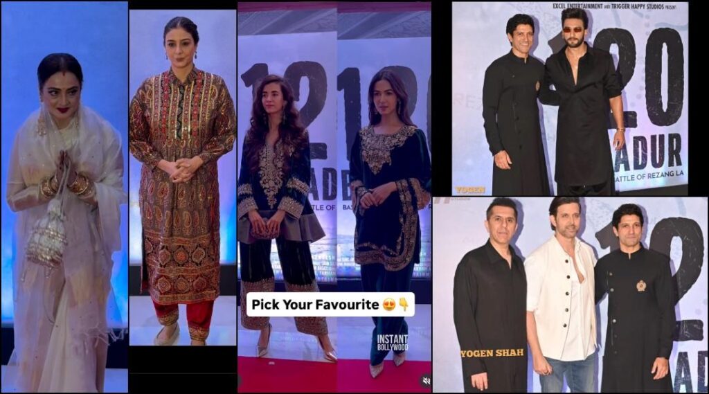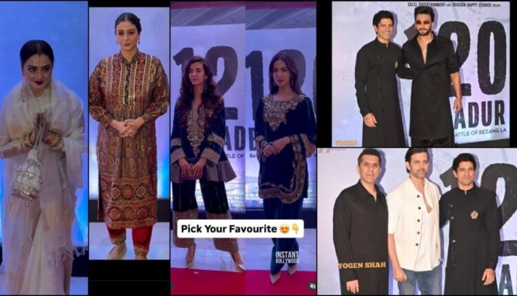 फरहान अख्तरचा 120 बहादूर हा चित्रपट काही तासांतच थिएटरमध्ये दाखल होणार आहे. शुक्रवारी (२१ नोव्हेंबर) रिलीज होण्यापूर्वी, निर्मात्यांनी बुधवारी रात्री तारांकित स्क्रीनिंगचे आयोजन केले. या कार्यक्रमाला इंडस्ट्रीतील अनेक दिग्गजांनी हजेरी लावली होती. रणवीर सिंग, सबा आझाद आणि हृतिक रोशनपासून ते फरहान अख्तर आणि रेखापर्यंत, सेलिब्रिटींनी प्रीमियरमध्ये ग्लॅम कोशिंट वाढवले.