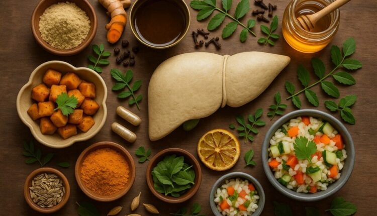 आयुष मंत्रालयाच्या म्हणण्यानुसार, यकृतासाठी फायदेशीर आयुर्वेदिक घटकांमध्ये आले (अर्डरक) आणि लसूण (रासोना), पाटोळ्याची पाने आणि फळे, पुनर्नवा किंवा बोरहाविया डिफ्यूसा यांचा समावेश आहे. आवळा, डाळिंब, द्राक्षे, पपई, संत्रा आणि लिंबू, मकोय (सोलॅनम निग्रम) पाने आणि शिग्रू (मोरिंगा ओलिफेरा) ची पाने या फळांचाही समावेश आहे, जे यकृताच्या आरोग्यासाठी वरदानापेक्षा कमी नाही.