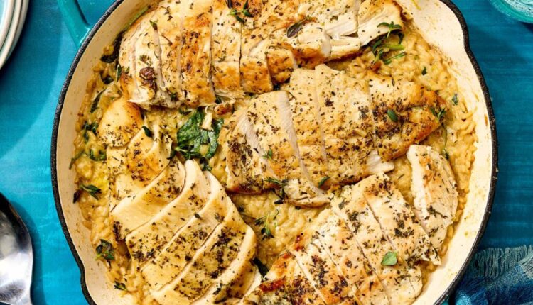 या प्रथिने-समृद्ध, वन-स्किलेट डिनरमध्ये मांसाहारी मशरूमने पॅक केलेल्या मलईदार फुलकोबी तांदळाच्या बेडवर भाजलेले कोमल चिकन मांड्या आहेत. कोंबडीच्या मांड्या जलद आणि सोयीस्कर असताना, तुम्ही त्यांच्या जागी अर्धवट हाड-इन चिकन स्तन बदलू शकता.