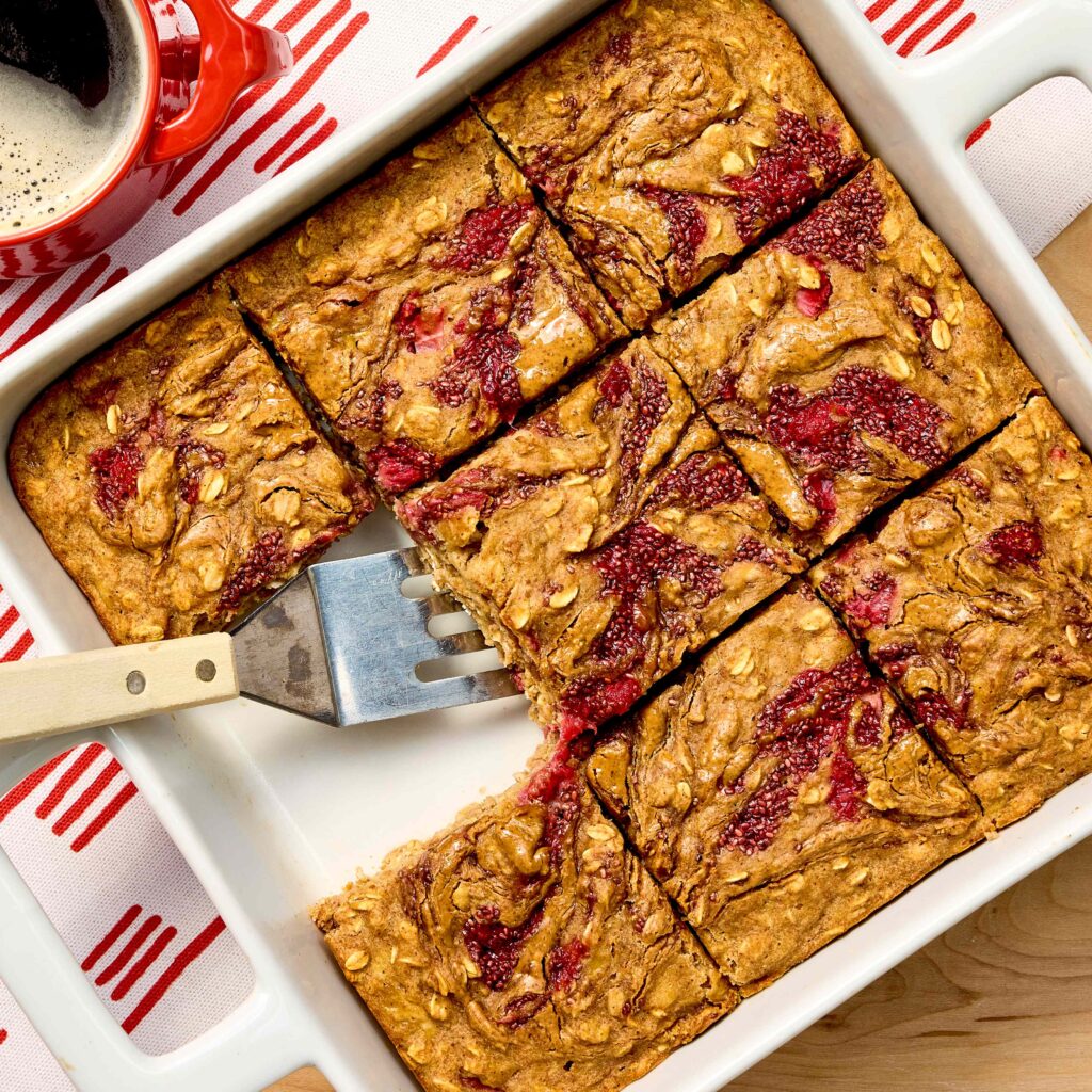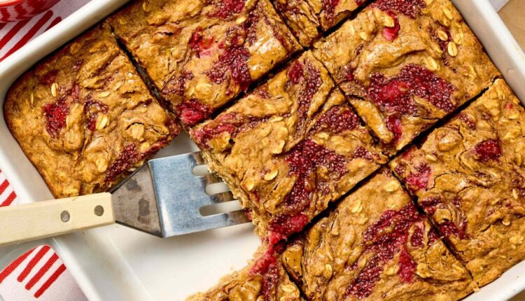 हे उच्च-प्रथिने ओटचे जाडे भरडे पीठ बार नाश्त्यासाठी, स्नॅकच्या वेळेसाठी किंवा हलके गोड मिष्टान्न म्हणून त्यांचा आनंद घेण्यासाठी योग्य आहेत. एक द्रुत स्टोव्हटॉप ब्लूबेरी-चिया “जॅम” पिठात फिरतो, ज्यामुळे फ्रूटी फ्लेवरचे पॉप तयार होतात. उबदार किंवा खोलीच्या तपमानावर सर्व्ह केले जाते, हे मऊ-बेक केलेले बार एक सोपा मेक-अहेड पर्याय आहेत ज्याची तुम्हाला आठवडाभर पुनरावृत्ती करावी लागेल.