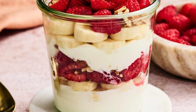 हे जलद आणि सोपे रास्पबेरी आणि दही parfait मलईदार ग्रीक-शैलीतील दही फायबर युक्त फळे आणि कुरकुरीत टोस्टेड पेकनसह आपल्या दिवसाची आतडे अनुकूल सुरुवात करण्यासाठी एकत्र करते. एका जारमध्ये साहित्य स्तरित केल्याने पोर्टेबल, सुंदर आणि प्रथिने-पॅक केलेले जेवण मिळते जे काही मिनिटांत तयार होते.