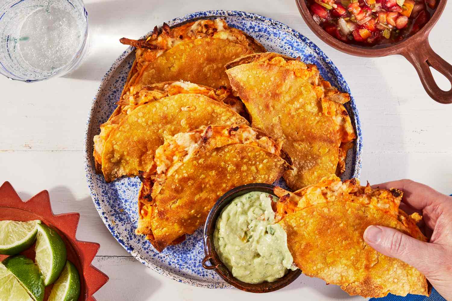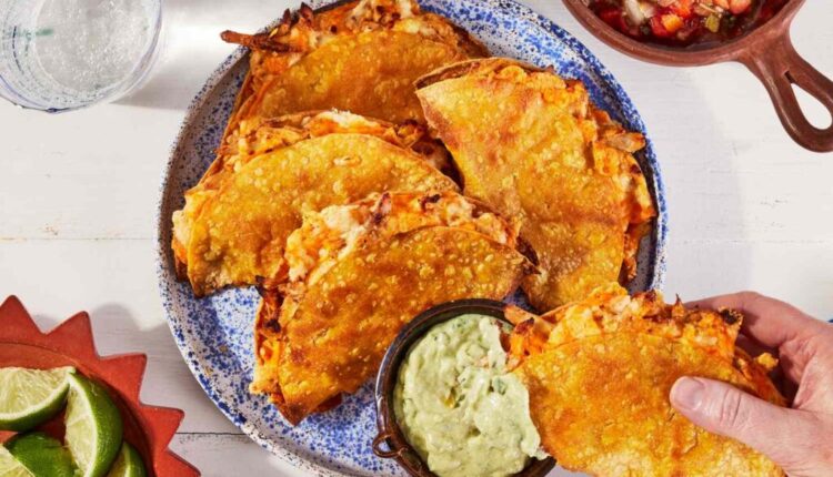 हे कुरकुरीत चिकन टॅको शीट पॅनवर भरलेले आणि बेक केले जातात जेणेकरून ते अतिशय कुरकुरीत बाहेरील आणि उबदार, वितळलेले मध्यभागी असेल. ताज्या कोथिंबीरसोबत मिळून क्रीमी ॲव्होकॅडो क्रेमा हा एक उत्तम पर्याय आहे. एका बेकिंग शीटवर टॅको पिळून घेण्याचा मोह करू नका – ते भरपूर जागेसह उत्तम प्रकारे कुरकुरीत होतात. बेकिंगच्या अर्ध्या बाजूने पॅन फिरवण्याची खात्री करा जेणेकरून ते समान रीतीने शिजतील.