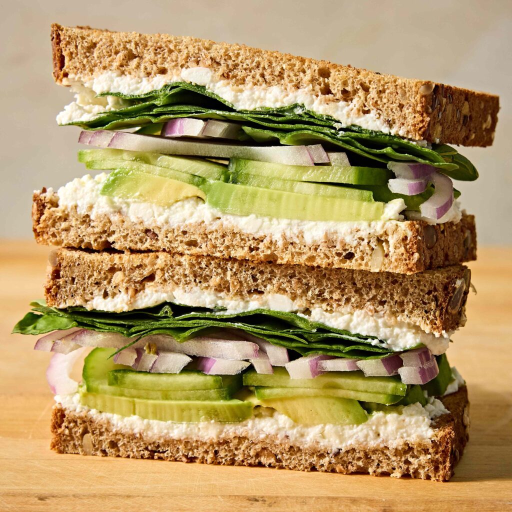 हे मलईदार, कुरकुरीत सँडविच खारट फेटा, कुरकुरीत काकडी आणि संपूर्ण गव्हाच्या टोस्टच्या तुकड्यांमध्ये रेशमी एवोकॅडो घालते. एक साधा दही-फेटा स्प्रेड समृद्धता आणि टँग जोडतो, तर पालक आणि लाल कांदा ताजेपणा आणतो आणि चावतो, जे जलद जेवणासाठी योग्य आहे.