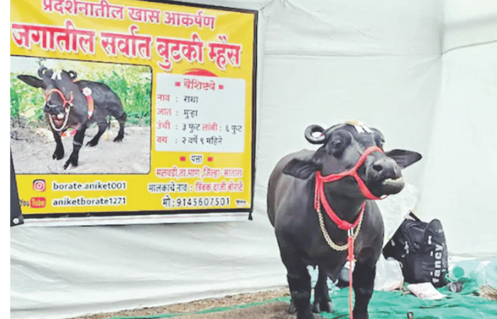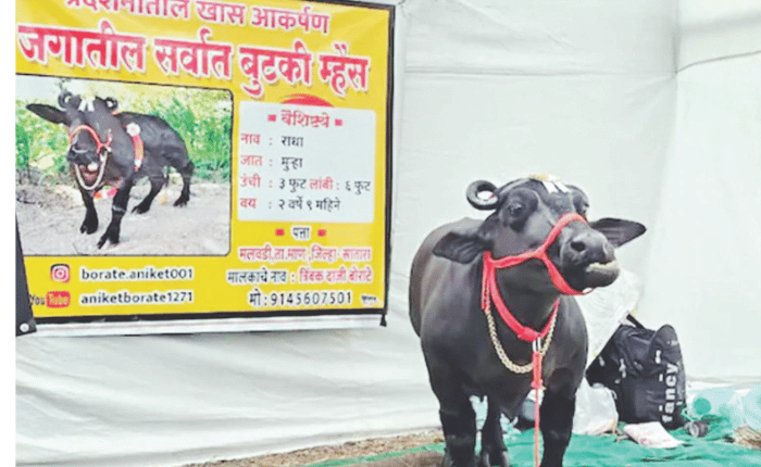 परळीत तहसील कार्यालयासमोरील विस्तीर्ण मैदानावर भरलेल्या या एक्सपोमध्ये राज्यासह देशभरातील विविध दर्जेदार पशुधनाच्या जाती सहभागी झाल्या आहेत. मात्र, या सर्वांमध्ये बुटक्या राधाने भाव खाल्ला. या विक्रमी म्हशीसोबत सेल्फी काढण्यासाठी गर्दी झाली.