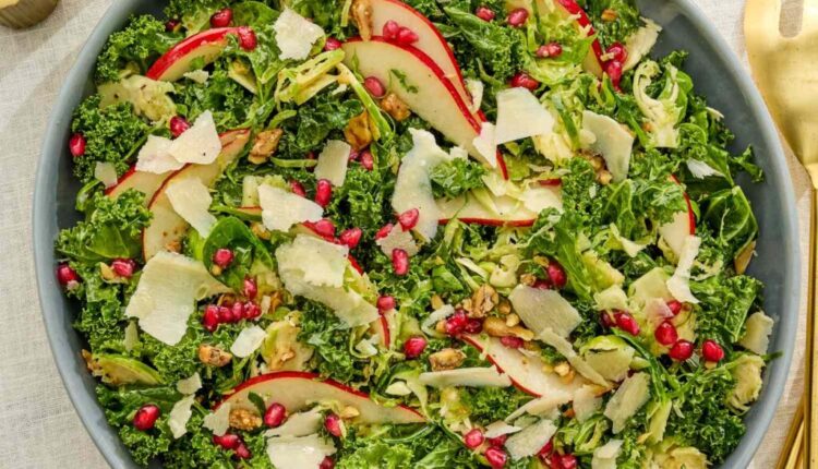 फायबर-पॅक केलेले काळे आणि ब्रुसेल्स स्प्राउट्स एका तिखट सफरचंद-साइडर व्हिनिग्रेटमध्ये कोमल केले जातात, जे त्यांच्या कडा मऊ करतात आणि त्यांना चव देतात. नाशपातीचे तुकडे एक रसाळ काउंटरपॉइंट जोडतात, तर कुरकुरीत डाळिंबाच्या आरील्समध्ये प्रत्येक काट्यामध्ये तुरटपणा येतो.