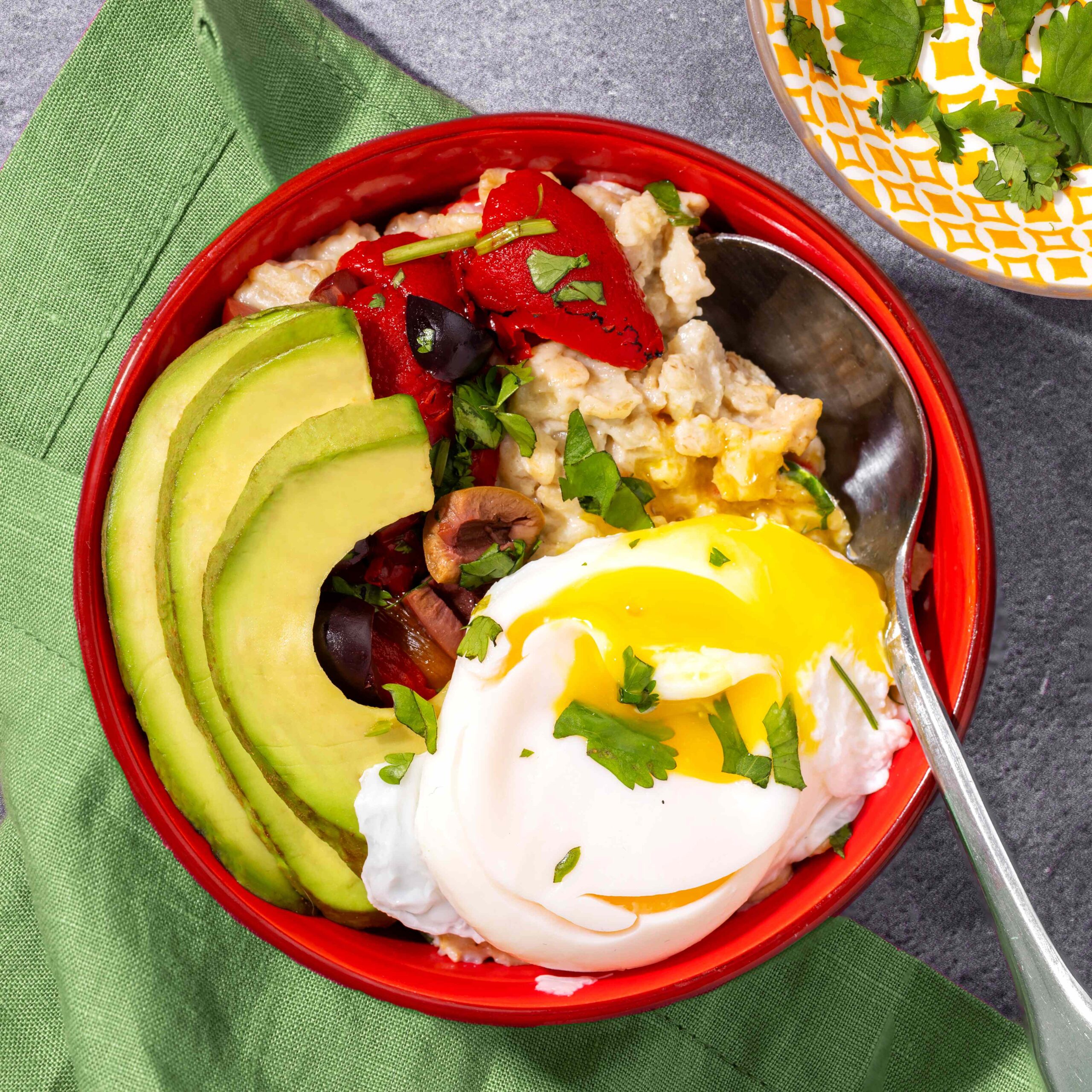 सॅव्हरी ओट्स हा संपूर्ण धान्याचा आनंद घेण्याचा एक कमी दर्जाचा मार्ग आहे—टॉपिंग्ज अंतहीन आहेत! सोया दुधात ओट्स शिजवणे हा या हार्दिक धान्य भांड्यात प्रथिने जोडण्याचा एक सोपा मार्ग आहे. येथे, आम्ही ओट्स वर चमकदार भाजलेले लाल मिरपूड-ऑलिव्ह मिश्रण आणि समृद्धीसाठी एक अंडी घालतो.