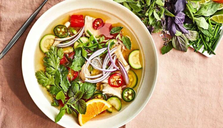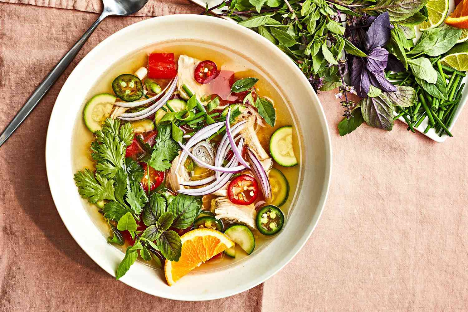 दिवंगत शेफ चार्ल्स फानच्या या रेसिपीमध्ये, चौथाई केलेले कांदे आणि फोडलेले आले भाजून घ्या, नंतर स्फटिक-स्पष्ट, खोल सुगंधी मटनाचा रस्सा काढण्यासाठी कोंबडीची हाडे आणि चतुर्थांश पक्षी सह मंद आणि हळू उकळवा. च्युई राईस नूडल्स, तुकडे केलेले पोच केलेले चिकन आणि ताजे गार्निशचे टेबलभर – मूग-बीन स्प्राउट्स, तुळस, जलापेनो, चुना, होईसिन आणि चिली-गार्लिक सॉस — प्रत्येक व्यक्तीला त्यांच्या स्वत: च्या वाडग्याची उष्णता, टँग आणि क्रंच कस्टमाइझ करण्याची अनुमती देते.