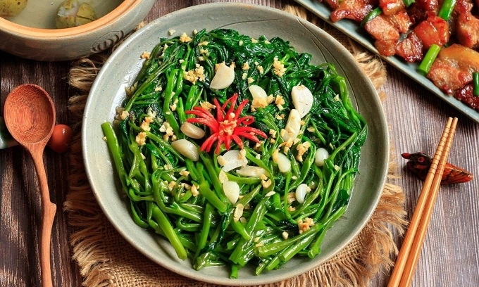 ढवळून तळलेले मॉर्निंग ग्लोरीच्या प्लेटमध्ये वारंवार भरपूर लसूण टाकले जाते. वाचा/बुई थुय द्वारे फोटो |