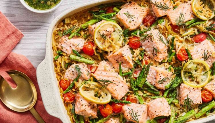 येथे, ओमेगा-3-युक्त सॅल्मन ओव्हनमध्ये बेक केलेल्या ऑरझो मिश्रणाच्या वर बसते, स्टोव्हटॉपवर उकळण्याऐवजी, ते शिजताना सर्व चमकदार आणि लिंबू चव शोषून घेते.