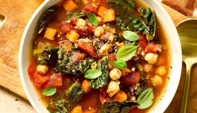 भाज्या, शेंगा आणि निरोगी चरबीवर लक्ष केंद्रित करून, हे स्लो-कुकर स्टू भूमध्यसागरीय आहाराचे पालन करणाऱ्यांसाठी बिल फिट करते. वेगळ्या वळणासाठी पांढऱ्या सोयाबीनसाठी चणे स्वॅप करा किंवा काळेच्या जागी कॉलर्ड्स किंवा पालक वापरून पहा.