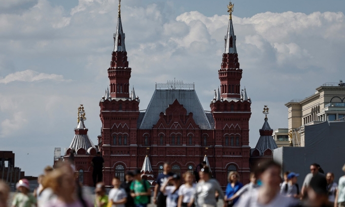 मॉस्को, रशिया, १८ मे २०२३ मधील स्टेट हिस्टोरिकल म्युझियमच्या इमारतीजवळ लोक रेड स्क्वेअरच्या बाजूने चालत आहेत. रॉयटर्सचा फोटो