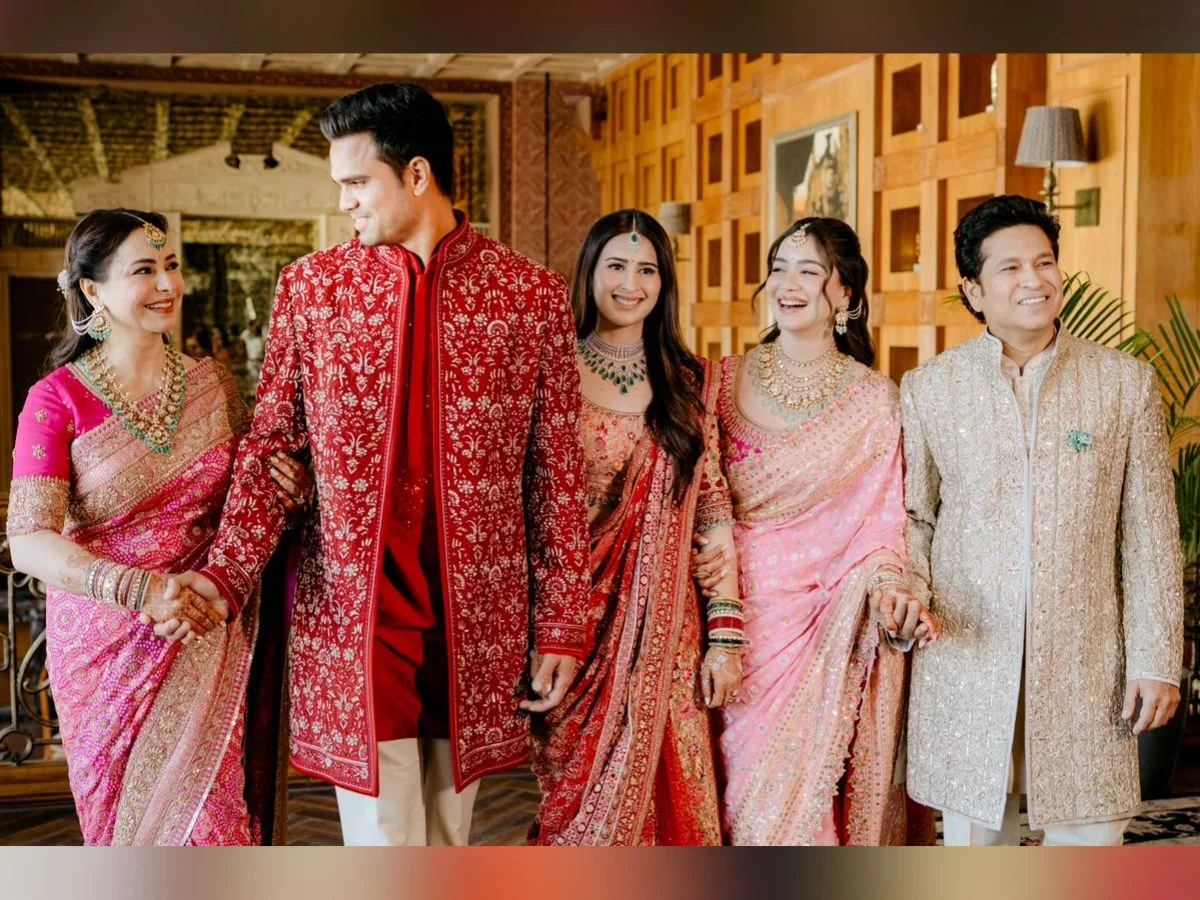 मुंबई : क्रिकेट जगातील मास्टर ब्लास्टर सचिन तेंडूलकरचा मुलगा अर्जुन तेंडूलकर हा सानिया चांडोकसोबत गुरुवारी, 5 मार्च रोजी विवाह बंधनात अडकला. यावेळी, फक्त क्रिकेट विश्वातीलच नव्हे तर नेते तसेच अभिनेत्यांनीही या लग्नाला हजेरी लावली होती. हा भव्य सोहळा मुंबईतील वरळी येथे पार पाडला. यावेळी अनेक दिग्गजांनी हजेरी लावली होती.