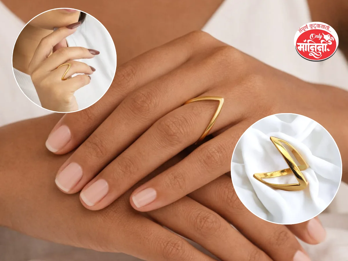 या अंगठीचं खास वैशिष्ट्य म्हणजे तिचं युनिक डिझाइन. ‘व्ही’ शेपमुळे बोटं अधिक स्लिम आणि लांब दिसतात, ज्यामुळे हातांची सुंदरता अधिक खुलते. ही अंगठी प्लेन गोल्डमध्येही उपलब्ध आहे, तसेच त्यात छोटे चमकदार स्टोन्स लावले की ते पण सुंदर झळाळी देतात. हही अंगठी रोजच्या वापरासाठीही योग्य आहे, कारण ती जास्त जड नाही आणि हातात घातल्यावर खूप कम्फर्टेबल वाटते. ऑफिस, कॉलेज किंवा एखाद्या छोट्या कार्यक्रमासाठीही ही अंगठी सहजपणे कॅरी करता येते.