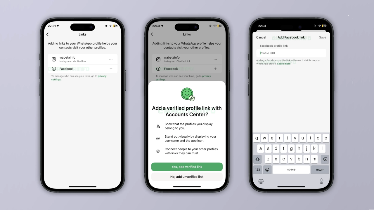 मूलभूतपणे, वापरकर्ते खाती केंद्राद्वारे कनेक्ट होऊ इच्छित नसल्यास सत्यापन केल्याशिवाय फेसबुक दुवा प्रदर्शित करू शकतात. व्हॉट्सअॅपने एक प्रोफाइल दुवा पर्याय जोडला आहे, जे वापरकर्त्यांना त्यांच्या सोशल मीडिया प्रोफाइलवर काय सामायिक करतात यावर संपूर्ण लवचिकता देते.