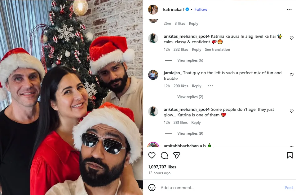 मध्ये घरी त्यांच्या सणाच्या उत्सवातील एक आरामदायक कौटुंबिक क्षण सामायिक करण्यासाठी अभिनेत्री इंस्टाग्रामवर गेली मुंबई. या चित्रात कतरिना सोबत त्याचा भाऊ विकी आहे सनी कौशलआणि तिचा भाऊ सेबॅस्टियन लॉरेंट मिशेलसुंदर सजवलेल्या ख्रिसमसच्या झाडासमोर सगळे हसत आहेत. या गटाने लाल-पांढऱ्या सांता टोप्याही घातल्या, त्यामुळे सुट्टीच्या आनंदात भर पडली.
