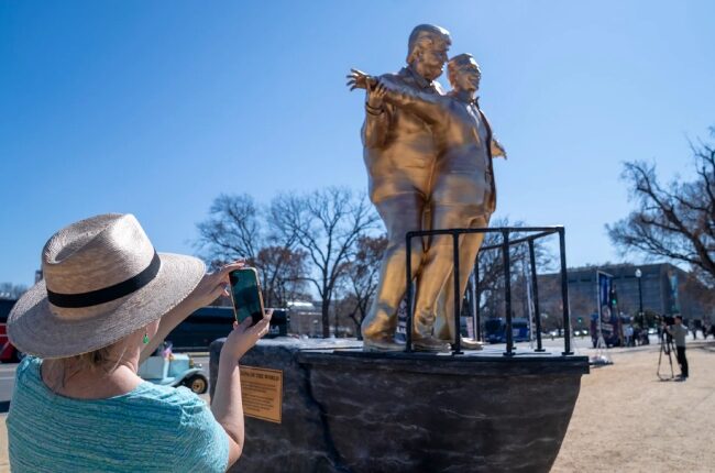 वॉशिंग्टन डीसीमध्ये टायटॅनिक पोझमध्ये ट्रम्प आणि एपस्टाईन यांचा पुतळा बसवला, अज्ञात कलाकाराचा यूएस प्रशासनावर हल्ला