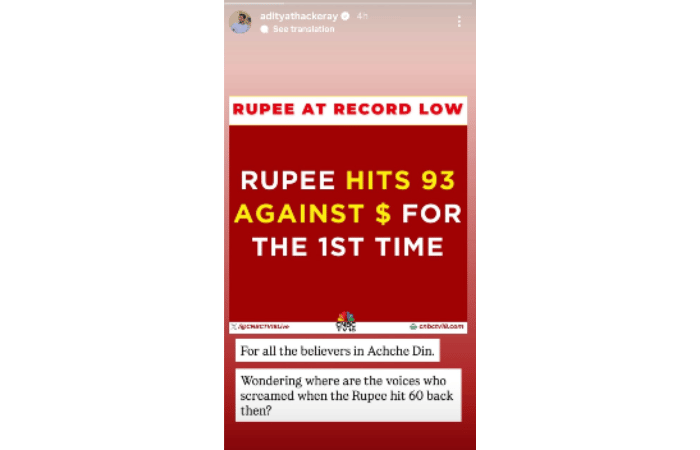 आदित्य ठाकरे यांनी सोशल मिडीया इन्स्टावर स्टोरी पोस्ट केली आहे, त्यात त्यांनी म्हटले आहे की, रुपया विक्रमी नीचांकी पातळीवर $ च्या तुलनेत रुपया पहिल्यांदाच ९३ वर पोहोचला. ही बातमी ‘अच्छे दिन’वर विश्वास ठेवणाऱ्या सर्वांसाठी. जेव्हा रुपया ६० वर पोहोचला होता, तेव्हा ओरडणारे ते आवाज आता कुठे गेले, असा प्रश्न पडतोय? असा सवालही त्यांनी केला आहे.