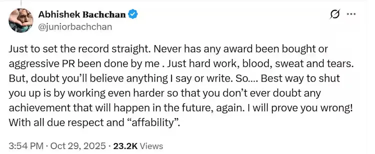 एका X वापरकर्त्याने त्याच्या बायोमध्ये “पत्रकार, संपादक, व्यापार विश्लेषक आणि क्रिकेट निन्जा” अशी स्वतःची ओळख करून दिल्यावर वाद सुरू झाला: “तो जितका मनमिळावू माणूस आहे तितकाच, मला हे सांगायला आवडत नाही की #अभिषेकबच्चन हे पुरस्कार विकत घेण्याचे प्रमुख उदाहरण आहे आणि आक्रमक PR तुम्ही अविवाहित राहिलो नाही तरीही… तुमच्या कारकिर्दीत त्याने या वर्षी #IWantToTalk साठी अवॉर्ड जिंकला आहे.