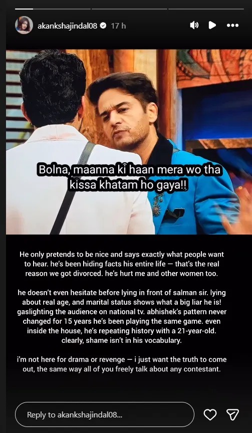 आकांक्षा जिंदालने तिच्या इंस्टाग्राम स्टोरीवर शोची एक क्लिप शेअर केली आहे. यामध्ये त्यांनी अभिषेकने लग्न आणि भूतकाळावर दिलेल्या वक्तव्यांवर टीका केली आहे. तो म्हणाला, 'तो फक्त छान असल्याचा आव आणतो आणि लोकांना जे ऐकायचे आहे तेच बोलतो. तो आयुष्यभर सत्य लपवत राहिला, हेच आमचे घटस्फोटाचे खरे कारण आहे. त्याने मला आणि इतर महिलांनाही दुखावले आहे.