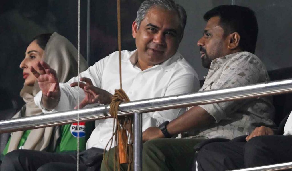 कोलंबो येथील आर. प्रेमदासा स्टेडियमवर भारत आणि पाकिस्तान यांच्यातील ICC पुरुष T20 विश्वचषक 2026 सामन्यादरम्यान आशियाई क्रिकेट परिषद आणि पाकिस्तानचे केंद्रीय गृहमंत्री मोहसिन नक्वी आणि श्रीलंकेचे अध्यक्ष अनुरा कुमारा दिसानायके.