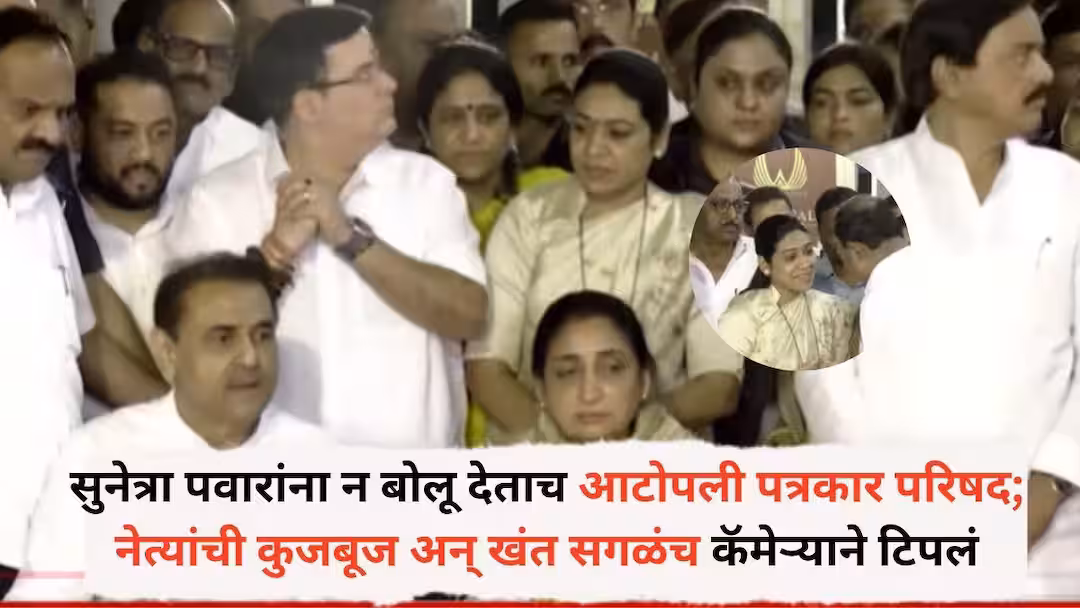 दादा जवळ कधी जाऊ देण्याची संधी दिली नाही, माणसांनी वहिनी जवळ तरी जाऊ द्यावं. त्यावेळी दुसरे नेते म्हणतात, प्रश्न घेऊ नका तुमचा बोलून झालं की थांबा, हे चांगलं केलं, स्पेशली प्रश्न करू नका, म्हणा मनस्थितीत नाहीत असं सांगा, बोलायचं आपलं आणि उठायचं, हे उलटे पालटे प्रश्न विचारतील ना, प्रेशर करतील तेव्हा तुम्ही उठवा, आम्ही थांबतो इथं बाजूला, बोलू नका माईक चालू आहे, अशी राष्ट्रवादीच्या नेत्यांची कुजबूज कॅमेरात कैद झाली आहे. त्याचवेळी सुनेत्रा पवार प्रफुल्ल पटेल आणि सुनील तटकरे पत्रकार परिषदेच्या ठिकाणी दाखल झाले, त्यावेळी सुनेत्रा पवार यांना सांगितलं, तुमचं स्टेटमेंट करायचं तुम्ही, त्याच्या पलीकडे आम्ही बोलू. त्यानंतर पत्रकार परिषद पार पडली आणि पत्रकार प्रश्न विचारण्याआधीच सगळे नेते उठले प्रफुल्ल पटेल यांनी सुनेत्रा पवारांना म्हटलं तुम्ही निघा, त्या गेल्यानंतर पुन्हा प्रफुल पटेल आणि सुनील तटकरे पत्रकार परिषदेच्या ठिकाणी खाली बसले. ही सगळी घटना कॅमेऱ्यामध्ये कैद झाली आहे.