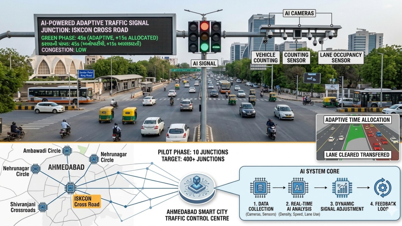अहमदाबादमध्ये स्मार्ट वाहतूक व्यवस्था: आता ट्रॅफिक सिग्नलवर विनाकारण उभे राहण्याचा त्रास संपू शकेल. गुजरातमधील अहमदाबादमध्ये नवीन एआय आधारित वाहतूक व्यवस्था लागू करण्यात आली आहे, जी शहराच्या वाहतुकीवर स्मार्ट पद्धतीने नियंत्रण करत आहे.