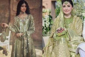 बारातच्या रात्री, मरियम नवाजने लांब, जडपणे सुशोभित केलेले कमीज असलेले आलिशान ऑलिव्ह-ग्रीन टिश्यू सिल्कचे कपडे निवडले. हा पोशाख नाजूक चांदीच्या जरदोजी आणि उत्तम धागा वर्कने समृद्ध झाला होता, एक स्लीक चुरीदार पायजमा आणि उत्तम प्रकारे समन्वयित दुपट्ट्याने जोडलेला होता. रीगल लुक पूर्ण करून, तिने स्वत: ला पारंपारिक पोल्की आणि कुंदन दागिन्यांसह सजवले आणि कालातीत कृपा दाखवली. डिझायनरच्या प्रिमियम ब्राइडल लाइनचा भाग असलेल्या या जोडणीची किंमत PKR 255,000 आणि PKR 355,000 दरम्यान असण्याचा अंदाज आहे.