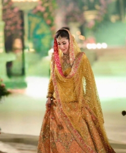 मेहंदी समारंभासाठी, मरियम नवाजने प्रसिद्ध पाकिस्तानी डिझायनर नोमी अन्सारी यांनी डिझाइन केलेला तेजस्वी मोहरी-पिवळा लेहेंगा चोली निवडली. हा पोशाख पारंपारिक गोटा वर्कसह अतिशय सुशोभित केलेला होता, उत्कृष्ट कारागिरी आणि उत्सवाचे आकर्षण दर्शविते. तपशीलवार हाताने अलंकार आणि ठळक बॉर्डरसह पूर्ण केलेला स्टेटमेंट दुपट्टा, तिच्या एकूण दिसण्यात सुसंस्कृतपणा जोडून सुंदरपणे रेखांकित करण्यात आला होता. फॅशन समीक्षकांनी अभिजाततेसह जीवंतपणाचा समतोल राखण्यासाठी तिच्या निवडीचे कौतुक केले.