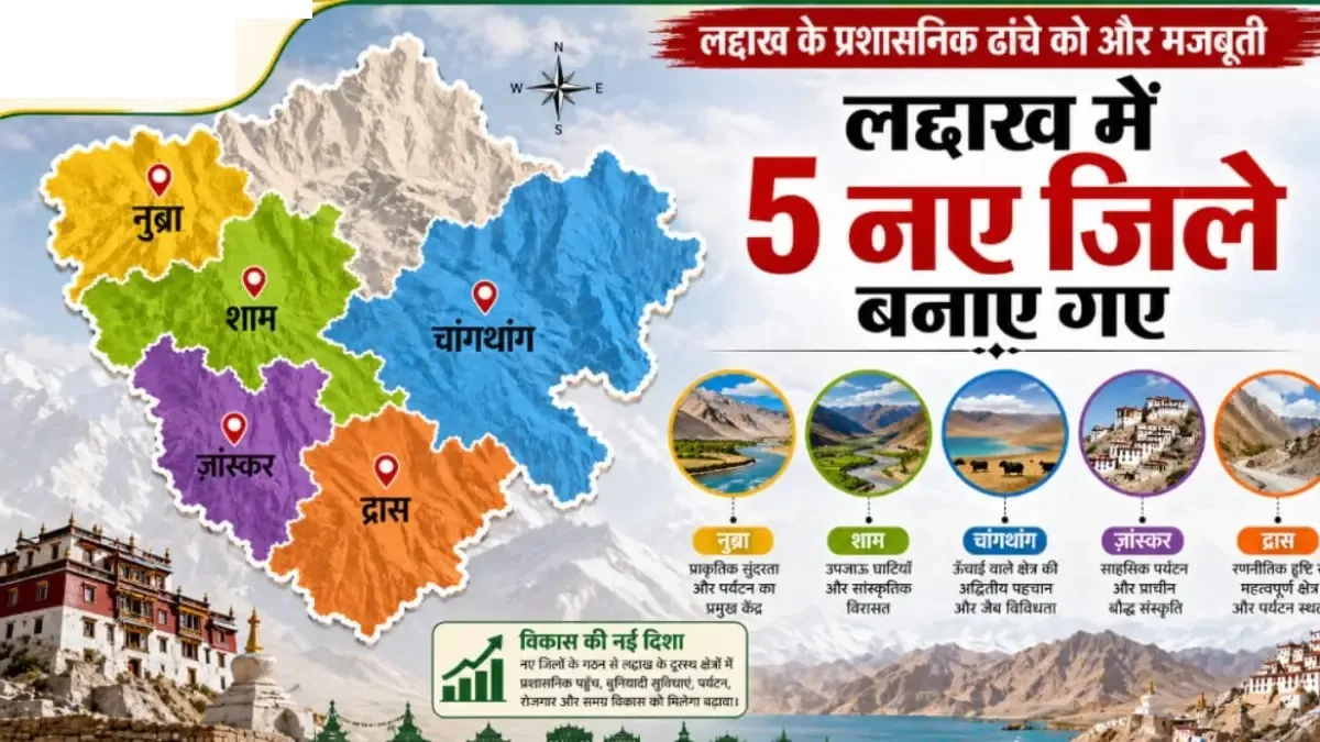 लडाखमधील प्रशासकीय संरचना मजबूत करण्याच्या दिशेने एक मोठे पाऊल उचलण्यात आले आहे. लडाखच्या उपराज्यपालांनी पाच नवीन जिल्हे तयार करण्याच्या अधिसूचनेला मंजुरी दिली आहे. नुब्रा, शाम, चांगथांग, झांस्कर आणि द्रास यांना नवीन जिल्हे म्हणून घोषित केल्यामुळे केंद्र सरकारच्या ‘विकसित लडाख’च्या संकल्पनेला चालना मिळाली आहे. या निर्णयामुळे लडाखमधील जिह्यांची एकूण संख्या दोनवरून सात झाली आहे. उपराज्यपाल व्ही. के. सक्सेना यांनी सोशल मीडिया पोस्टद्वारे या निर्णयाची माहिती दिली.