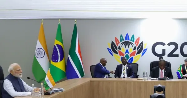 पंतप्रधान नरेंद्र मोदी यांनी आज जोहान्सबर्ग येथे दक्षिण आफ्रिकेचे अध्यक्ष सिरिल रामाफोसा यांची G-20 शिखर परिषदेच्या निमित्ताने भेट घेतली. यावेळी दोन्ही नेत्यांनी ग्लोबल साउथचा आवाज बुलंद करण्यासाठी एकत्र काम करण्याचे मान्य केले. IBSA नेत्यांची बैठक बोलावण्याच्या दक्षिण आफ्रिकेच्या पुढाकाराची पंतप्रधानांनी प्रशंसा केली. भारत-दक्षिण आफ्रिका संबंध दृढ करणाऱ्या ऐतिहासिक संबंधांची आठवण करून, दोन्ही नेत्यांनी परस्पर संबंधांचा आढावा घेतला. व्यापार आणि गुंतवणूक, अन्न सुरक्षा, कौशल्य विकास, खाणकाम, युवा देवाणघेवाण आणि लोक-लोक संबंध यासह सहकार्याच्या विविध क्षेत्रात झालेल्या प्रगतीबद्दल त्यांनी समाधान व्यक्त केले. त्यांनी एआय, डिजिटल सार्वजनिक पायाभूत सुविधा आणि आवश्यक खनिजे क्षेत्रात सहकार्य वाढवण्याच्या मार्गांवर चर्चा केली. नाही