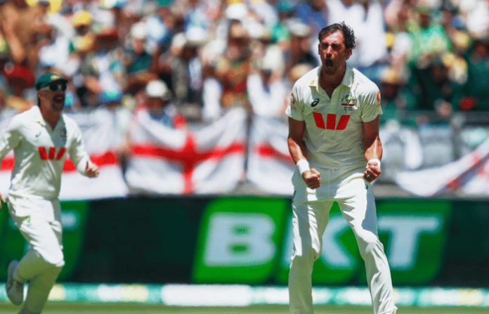 मिचेल स्टार्केने सलामीला बेन डकेटला भोपळाही फोडू दिला नाही आणि 5 या धावसंख्येवर इंग्लंडला पहिला हादरा दिला. त्यानंतर आलेल्या ओली पोपची सुद्धा स्टार्कने भंबेरी उडवून दिली आणि त्याचा त्रिफळा नेस्तनाबूत केला. ओली पोप सुद्धा शुन्यावर आल्या पावली तंबुत परतला. पाच धावांवर दोन विकेट अशी इंग्लंडची अवस्था झाली होती. जॅक क्रॉलीने 76 धावांची सलामी दिली त्यामुळे संघाचा डाव सावरला. क्रॉली बाद झाल्यानतंर जो रूट आणि हॅरी ब्रुक यांनी धावसंख्या वेगवान करण्याचा प्रयत्न केला. परंतू ब्रुकलाही स्टार्कने बाद केलं आणि ऑस्ट्रेलियायाला चौथा हादरा दिला. संघाजी चौथी विकेट आणि स्टार्काने आपल्या तिसऱ्या विकेटसह कसोटी क्रिकेटमध्ये सर्वाधिक विकेट घेणारा डावखूरा वेगवान गोलंदाज होण्याचा बहुमान आपल्या नावावर केला.