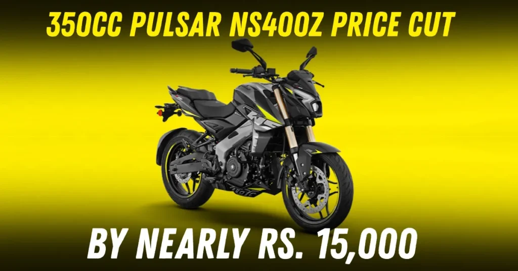 सुधारित 349cc इंजिनसह अद्ययावत Pulsar NS400Z लाँच केल्यानंतर एका आठवड्यापेक्षा कमी कालावधीनंतर, बजाज ऑटोने त्याची किंमत 1.80 लाख रुपये एक्स-शोरूम दिल्लीपर्यंत कमी केली आहे. 20 एप्रिल रोजी लॉन्च झालेल्या 349cc आवृत्तीची मूळ किंमत 1.93,900 रुपये एक्स-शोरूम होती, जी आउटगोइंग 373cc व्हेरियंटमध्ये बदललेली नाही. अंदाजे 13,000 ते 14,000 रुपयांच्या किंमतीतील कपातीमुळे मोटरसायकल 300 ते 400cc सेगमेंटमध्ये अधिक स्पर्धात्मक स्थितीत येते.