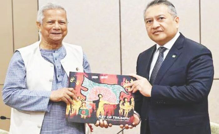 बांगलादेशातील हंगामी सरकारचे सल्लागार मोहम्मद युनूस यांनी पुन्हा हिंदुस्थानला डिवचले आहे. युनूस यांनी पाकिस्तानी लष्करातील जनरल साहीर शमशाद मिर्झा यांना एक पुस्तक भेट दिले असून त्या पुस्तकाच्या मुखपृष्ठावरील नकाशावर हिंदुस्थानच्या ईशान्येकडील राज्यांना बांगलादेशचा भाग दाखवण्यात आले आहे. त्यामुळे नवा वाद उभा राहिला आहे.