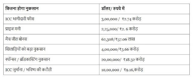 PTI च्या अहवालानुसार, बांगलादेश क्रिकेट बोर्डाने ICC T20 विश्वचषक 2026 मधून बाहेर पडल्यानंतर बांगलादेशला US$ 27 दशलक्ष किंवा 240 कोटी रुपयांचे नुकसान होणार आहे. ICC आपल्या स्पर्धेत सहभागी होणाऱ्या सर्व संघांना रक्कम देते, जी आता बांगलादेशला मिळणार नाही.