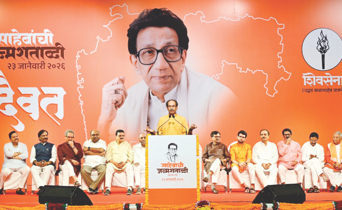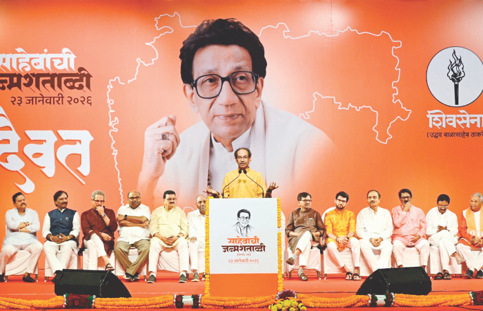 हिंदुहृदयसम्राट शिवसेनाप्रमुख बाळासाहेब ठाकरे यांच्या जन्मशताब्दी वर्षाचा आज शिवसेना पक्षप्रमुख उद्धव ठाकरे आणि मनसे अध्यक्ष राज ठाकरे यांच्या उपस्थितीत झालेल्या सोहळ्याने दिमाखदार प्रारंभ झाला. अवघे षण्मुखानंद सभागृह खच्चून भरले होते. याच गर्दीच्या साक्षीने उद्धव ठाकरे यांनी मुंबई-महाराष्ट्र गिळायला निघालेल्या भाजपच्या दिल्लीश्वरांवर हल्ला चढवला. ‘मेलो तरी बेहत्तर, पण त्या दोन व्यापाऱ्यांचे गुलाम म्हणून जगणार नाही अशी शपथ घ्या’, असे खणखणीत आवाहन उद्धव ठाकरे यांनी केले. मुंबईत निकराने लढणाऱया शिवसैनिकांची उद्धव ठाकरे यांनी पाठ थोपटली आणि शिवसेनेला पालवी फुटलीय, चला नव्याने सुरुवात करूया, अशी साद घातली तेव्हा षण्मुखानंदमध्ये ‘जय महाराष्ट्र… जय भवानी…जय शिवाजी’ अशी गर्जना घुमली.