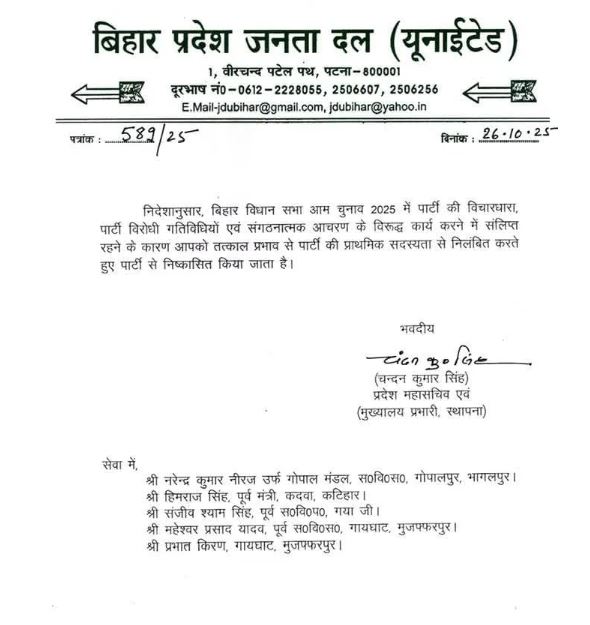 जेडीयूचे प्रदेश सरचिटणीस चंदन कुमार सिंह यांनी हकालपट्टीचे पत्र जारी केले. निलंबित करण्यात आलेल्या प्रमुख नेत्यांमध्ये मुंगेर-जमालपूरचे माजी मंत्री शैलेश कुमार, जमुई-चकई विधानपरिषदेचे माजी सदस्य संजय प्रसाद, सिवान-बरहरियाचे माजी आमदार श्याम बहादूर सिंह, भोजपूर-बराहाराचे माजी आमदार रणविजय सिंह, शेखपुरा-बरबिघाचे माजी आमदार सुदर्शन कुमार, अमर कुमार सिंह, कुमार सिंह यांचा समावेश आहे. बेगुसराय जिल्ह्यातील साहेबपूर कमल येथील रहिवासी, वैशालीच्या डॉ. अस्मा परवीन, औरंगाबादचे लव कुमार, कटिहारच्या आशा सुमन, पूर्व चंपारणचे दिव्यांशु भारद्वाज आणि सिवानचे विवेक शुक्ला. निवडणुकीदरम्यान अनुशासनहीनता आणि पक्षविरोधी कारवाया खपवून घेतल्या जाणार नाहीत, असे पक्षाने स्पष्ट केले.