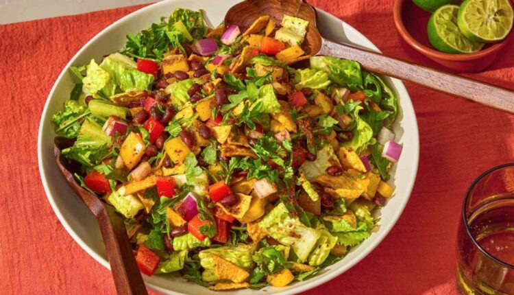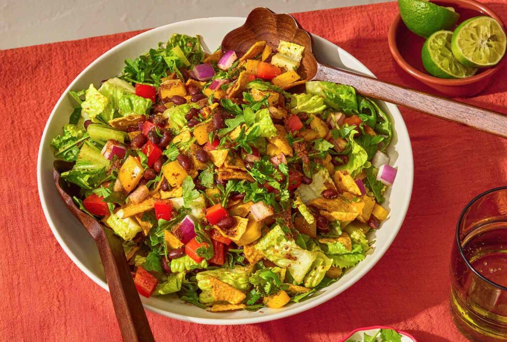 हे ब्लॅक बीन फजिता सॅलड ताजे, नो-कूक फॉरमॅटमध्ये फजिताचे ठळक, चवदार फ्लेवर्स देते. एक द्रुत लिंबू-स्पाइक मॅरीनेड काळ्या सोयाबीन आणि मिरपूड घालते, तर कुरकुरीत हिरव्या भाज्या आणि कुरकुरीत टॉर्टिला चिप्स पोत वाढवतात. हे फक्त 30 मिनिटांत एकत्र येते, जे लंच किंवा हलके डिनरसाठी एक सोपा पर्याय बनवते.