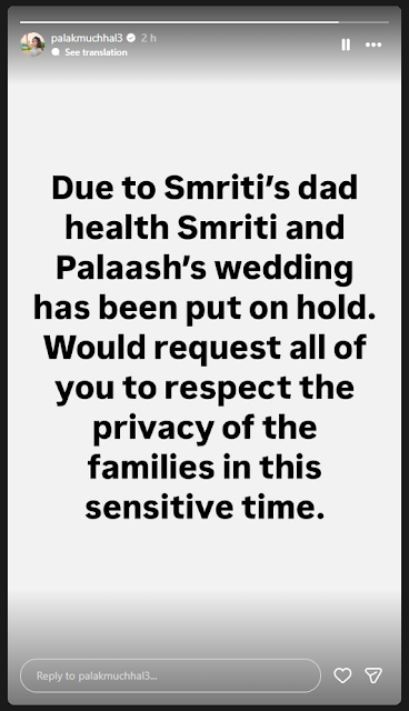 सोशल मीडिया आणि बातम्यांमध्ये अनेक अफवा सुरू असताना, पलाश मुच्छालची बहीण आणि सुप्रसिद्ध गायिका पलक मुच्छाल पुढे आली आणि लग्न पुढे ढकलण्याचे कारण स्पष्ट केले. पलकने इंस्टाग्राम स्टोरीवर लिहिले आहे की, “स्मृतीच्या वडिलांच्या प्रकृती अस्वास्थ्यामुळे स्मृती आणि पलाशचे लग्न तूर्तास स्थगित करण्यात आले आहे. आम्ही सर्वांना विनंती करतो की या संवेदनशील वेळी कुटुंबांच्या गोपनीयतेचा आदर करावा.”