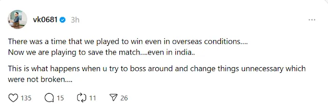 “एक काळ असा होता जेव्हा आम्ही परदेशात जिंकण्यासाठी खेळायचो. आता आम्ही मायदेशातही सामने वाचवण्यासाठी खेळतो. जेव्हा तुम्ही स्वतः बॉस बनण्याचा प्रयत्न करता आणि कधीही चुकीच्या गोष्टी बदलण्याचा प्रयत्न करता तेव्हा असे होते.”