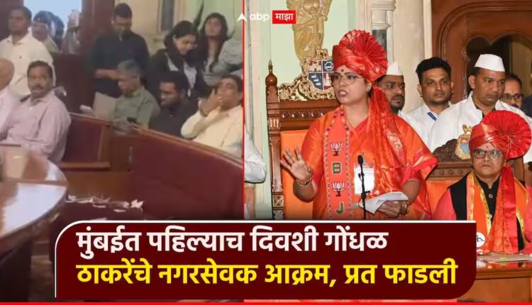मुंबई: राज्याचं लक्ष लागलेल्या मुंबईबाई). महापालिकेत अखेर आज महापौरपदी भाजप नेत्या रितू तावडे यांनी शपथ घेत पदभार स्वीकारला. तर, शिवसेनेच्या संजय घाडी यांची उपमहापौरपदी निवड झाली असून त्यांचाही शपथविधी सोहळा संपन्न झाला. त्यामुळे, मुंबई महापालिकेचं (BMC) कामकाज आजपासून खऱ्या अर्थाने सुरू झाल्याचं पाहायला मिळालं. मात्र, पहिल्याच दिवशी सत्ताधारी आणि विरोधकांमध्ये चांगलाच गोंधळ झाल्याचं दिसून आलं. काँग्रेसच्या महिला नगरसेवकांनी आक्रमक होत घोषणाबाजी केली. तर, ठाकरेंच्या नगरसेवकांनीही सभागृहातून काढता पाय घेतला.