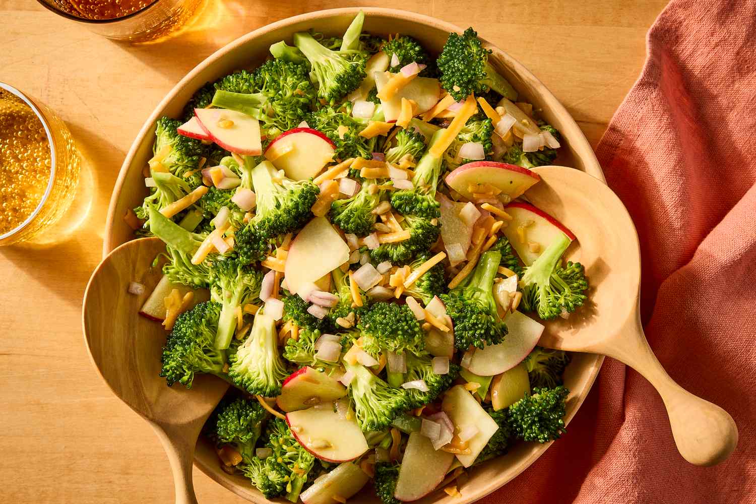 हे कुरकुरीत, रंगीबेरंगी ब्रोकोली-सफरचंद सॅलड हे सिद्ध करते की ब्रोकोली भाजल्याप्रमाणेच चवदार कच्ची आहे. एक तिखट सफरचंद-साइडर व्हिनेग्रेट, डिजॉन आणि मधाने उजळते, कच्च्या फुलांच्या चाव्याला मऊ करते आणि ते फ्रिजमध्ये मॅरीनेट करतात. सर्व्ह करण्यापूर्वी, गोड-खारट-कुरकुरीत फिनिशसाठी हनीक्रिस्प सफरचंदाचे पातळ तुकडे, तीक्ष्ण चेडर आणि कुरकुरीत सूर्यफूल बिया मिसळा.