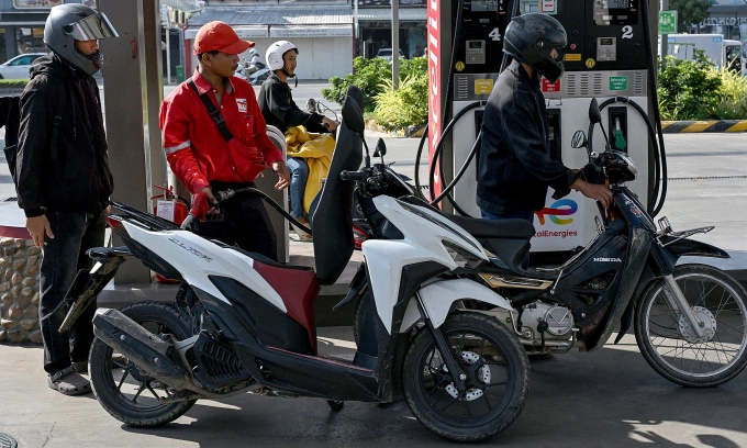 नोम पेन्ह येथील गॅस स्टेशनवर 9 मार्च 2026 रोजी एक कर्मचारी (2रा L) ग्राहकाच्या वाहनात पेट्रोल टाकत आहे. AFP द्वारे फोटो