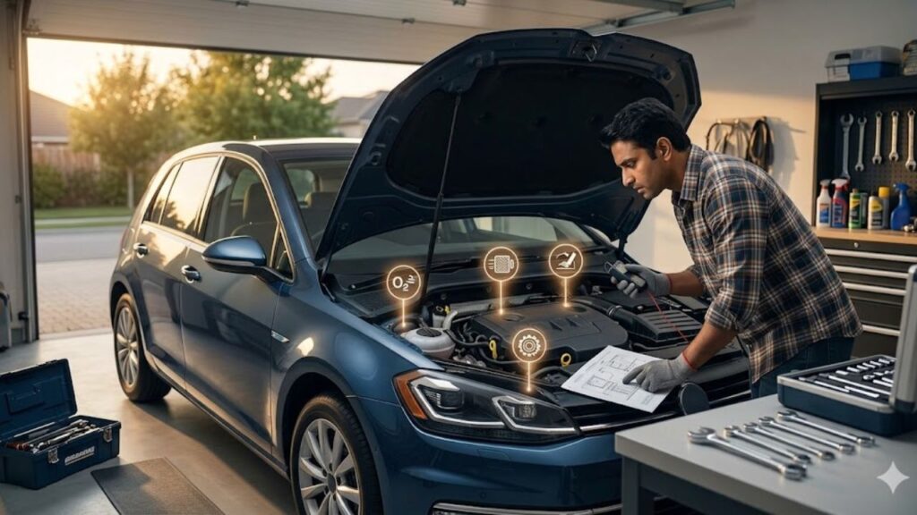 हा सेन्सर एक्झॉस्टमधील ऑक्सिजनचे प्रमाण मोजून योग्य हवा-इंधन मिश्रण राखतो. मायलेज कमी होणे, जास्त धूर, इंजिन नीट न पडणे ही त्याची लक्षणे आहेत.